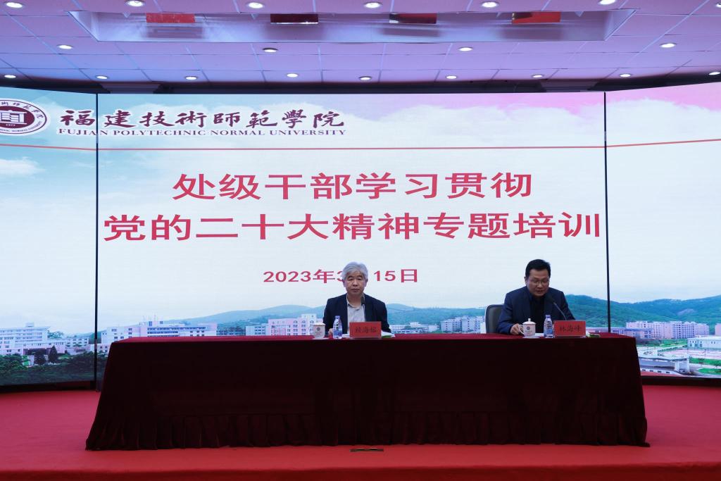 为贯彻落实党中央决策部署和省委工作要求,3月15日下午,我校处级干部学习贯彻党的二十大精神专题培训班在五马山校区科学楼学术报告厅举行首场集中培训,校党委书记赖海榕作了题为《以党的二十大精神为指引 奋力推进学校事业再上新台阶》的辅导报告。报告会由校党委副书记林海峰主持,全体处级干部参加了学习培训。